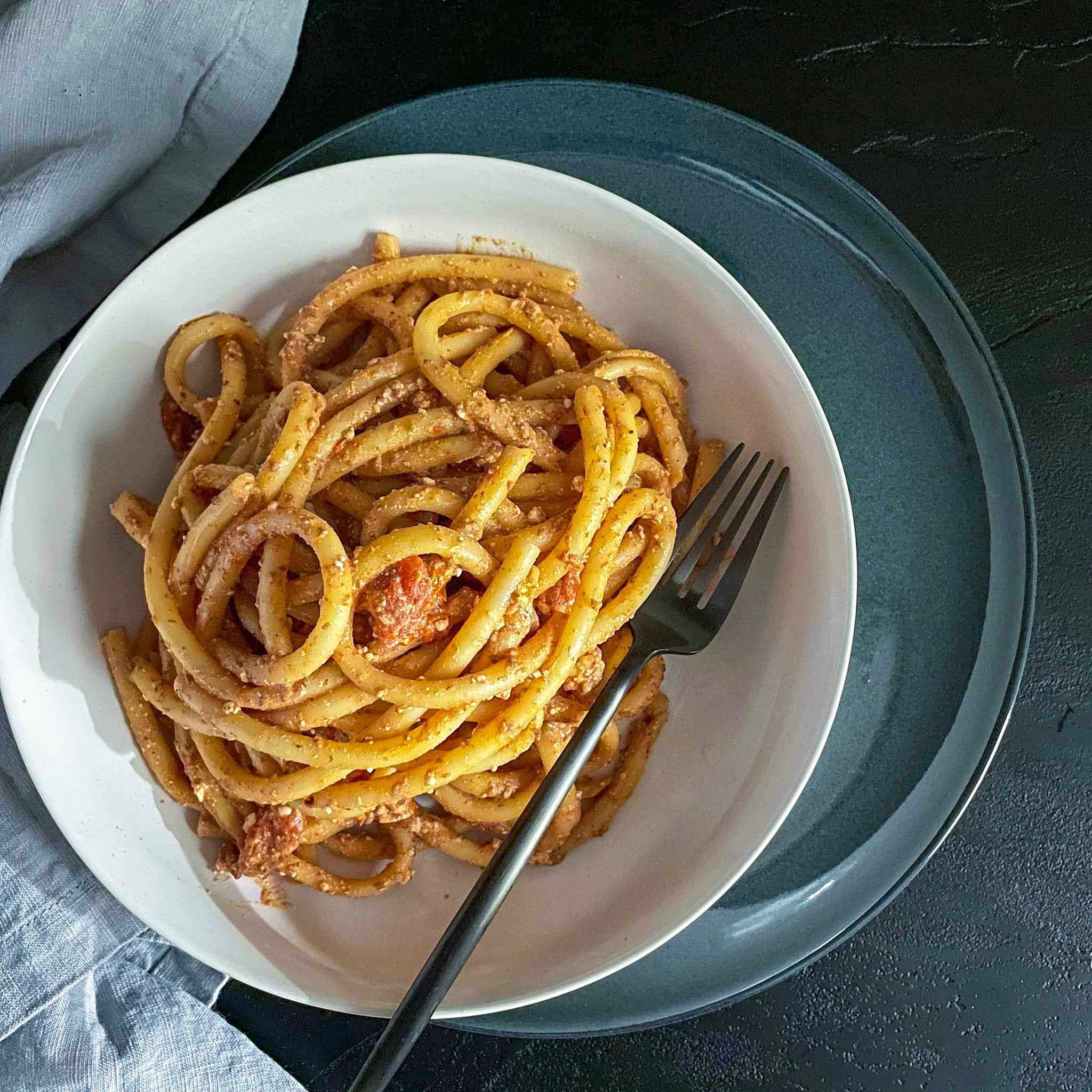 - Daca nu e format sosul, mai adaugati din apa de la fiertul pastelor si serviti pastele calde